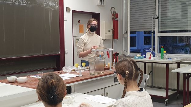 Am 21.12.2022 waren wir im Gymnasium am Mosbacher Berg in Wiesbaden zu Gast und gestalteten einen Praxisworkshop zum Thema Pflanzenchromatographie für interessierte Mädchen der Klassenstufe 8 und 9. In einer Doppelstunde trennten die teilnehmenden Schülerinnen gemeinsam mit einer Biologiestudentin einzelne Blattfarbstoffe aus Lorbeer- und Ginkgoblättern mittels DC-Chromatographie auf, um z.B. zu verstehen, welche Funktion bestimmte Blattfarbstoffe haben und warum sich Laub im Herbst beispielsweise verfärbt.