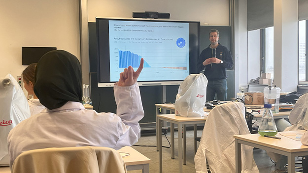 Am 08.02.2023 waren wir zum Berufsorientierungstag des Gymnasiums am Mosbacher Berg in Wiesbaden eingeladen, um den teilnehmenden Schülerinnen der Oberstufe unsere Initiative sowie das Berufsfeld einer Chemikerin und den Weg dahin vorzustellen. Mit dabei waren die beiden Chemie-Doktorandinnen Laura und Sophie, die über das Chemie-Studium, die Berufsmöglichkeiten als Chemikerin sowie ihren Arbeitsalltag an der Universität berichteten. Zudem gaben sie auch spannende Einblicke in ihr Arbeitsfeld Photochemie und wie dieses zum Klimaschutz beitragen kann.