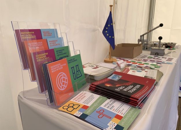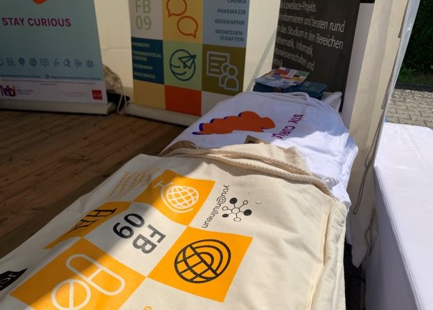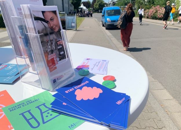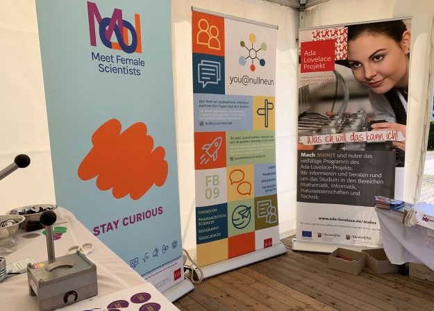 Am 26.06.2024 konnten Studieninteressierte beim „Tag der offenen Uni“an der Johannes Gutenberg-Universität Veranstaltungen ihrer Wunsch-Studienfächer besuchen, dem vielfältigen Bühnenprogramm lauschen sowie zahlreiche weitere Angebote der Uni und den Campus kennenlernen. Auch in diesem Jahr war Meet Female Scientists wieder vertreten. Der gemeinsame Stand von Meet Female Scientists, dem Ada-Lovelace-Projekt (https://ada-lovelace.de/standorte/mainz/) und dem Fachbereich 09 (https://nullneun.uni-mainz.de/) war gut besucht. Bei hochsommerlichen Temperaturen konnten sich Interessierte bei uns über die vielfältigen MINT-Studiengänge an der JGU informieren. Auch die verschiedenen Unterstützungsmöglichkeiten, die es für Frauen im MINT-Bereich an der Uni Mainz gibt, wurden vorgestellt. Es ergaben sich spannende Gespräche mit MINT-begeisterten Schüler:innen, Student:innen und Lehrkräften über Naturwissenschaften, Studienmöglichkeiten und mögliche Berufsbilder. Nicht zuletzt erfreuten sich auch die MFS-Postkarten und Stoffbeutel sowie die Buttonmaschine zur Herstellung eigener Buttons großer Beliebtheit bei den Besucher:innen.